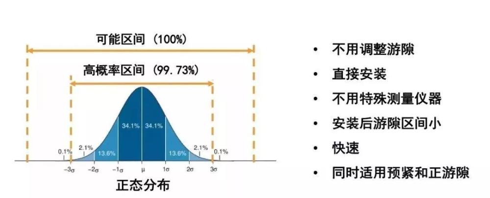 Set-Right使用概率方法并控制相關(guān)零件的尺寸公差來確保所有的裝配總成中有99.73%的軸承游隙落在可接受的范圍內(nèi)。這是一組隨機(jī)變量組合后的數(shù)學(xué)預(yù)測(cè),變量就是軸承公差和軸、軸承座等安裝組件的公差。