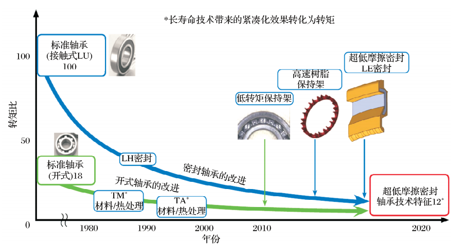 不同類型深溝球軸承的結(jié)構(gòu)和性能特點見表1。通過比較轉(zhuǎn)矩,自20世紀80 年代以來深溝球軸承的技術(shù)史如圖2所示。